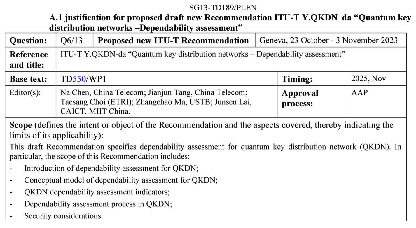 10月23日至11月3日,國際電信聯(lián)盟電信標(biāo)準(zhǔn)部門第13研究組(ITU-T SG13)全體會議在瑞士日內(nèi)瓦召開。會上,由中國電信研究院牽頭的國際標(biāo)準(zhǔn)立項提案:ITU-T Y.QKDN-da: “Quantum key distribution networks – Dependability assessment” (量子密鑰分發(fā)網(wǎng)絡(luò)——可靠性評估)獲批立項。這是央企在推動量子通信網(wǎng)絡(luò)國際標(biāo)準(zhǔn)化過程中的首個重要成果。